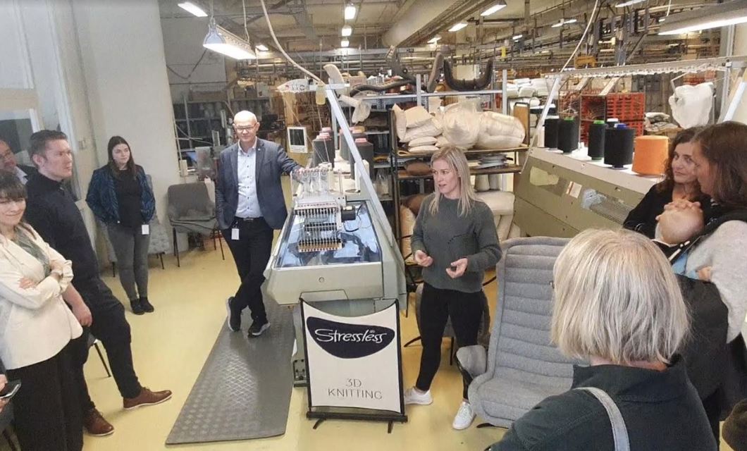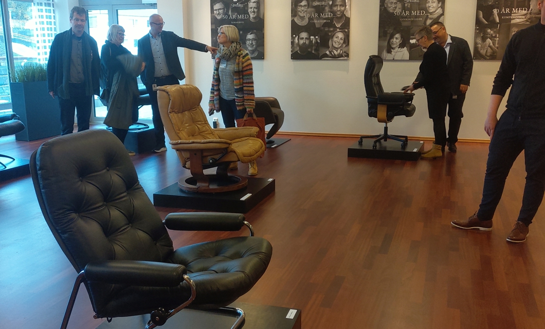 Vi vart tatt imot av Sindre G. Flo og fekk omvisning på Ekornes med presentasjon av alt frå klassikarar til årets kolleksjon. Ein spennande film med historikk og dagens ståstad spedde på informasjonen.