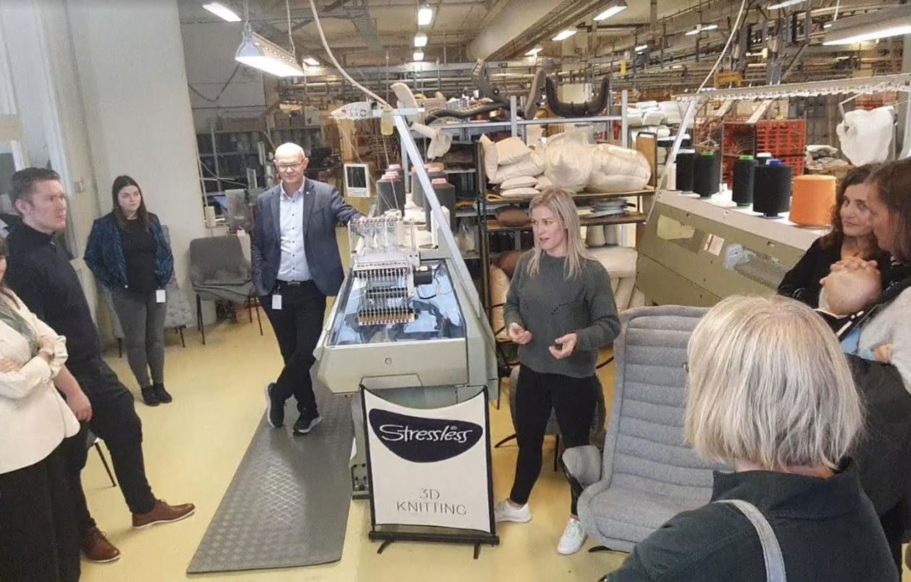 Det var utruleg spennende å sjå korleis tre strikkemaskiner , som arbeida i opp til tre lag samtidig, kunne produsere ferdige trekk over natta. Maskinene strikka i 3D, ingen klipping, ingen saum, berre å tre det på stol eller sofa.