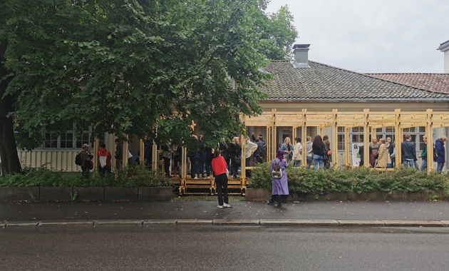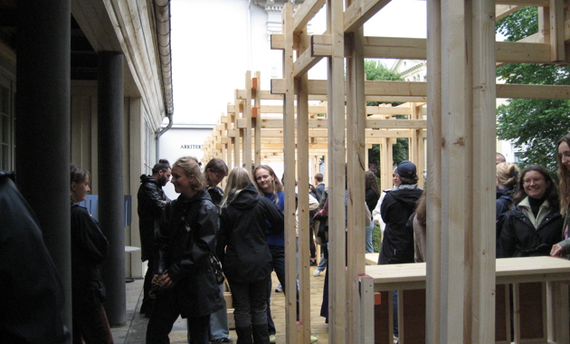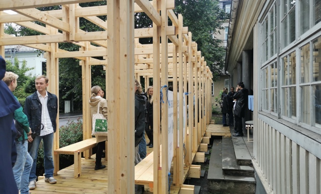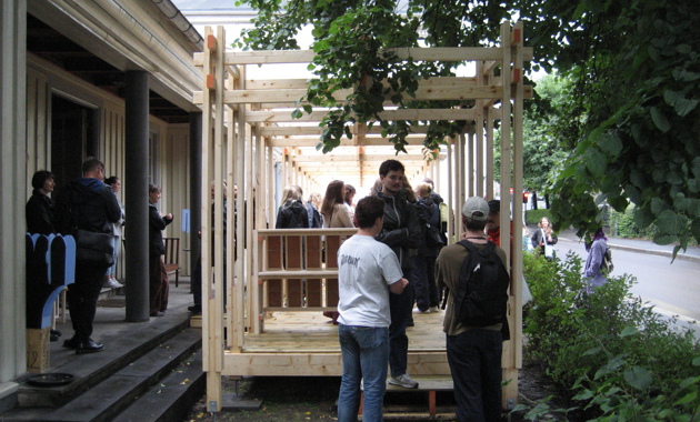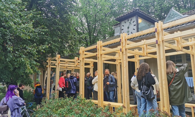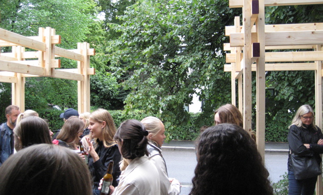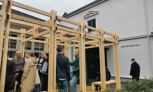 Årets Trestykker bygget en paviljong i forhagen til Arkitektenes Hus, for sosiale sammenkomster, komplett med egendesignede møbler og bar for mingling.