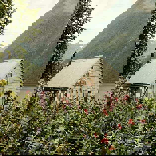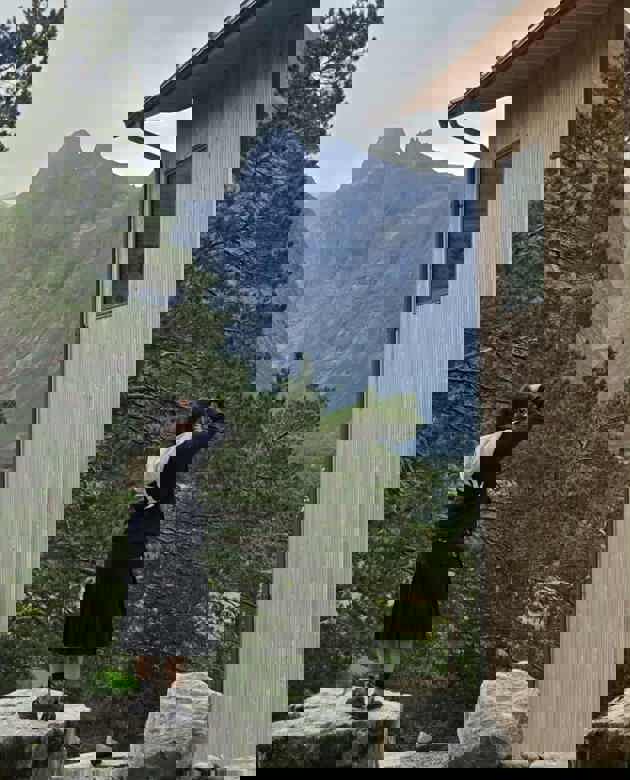 Vi avsluttet med Reiulf Ramstads minimalistiske Bratte Boliger med konsekvente treinteriører og uvirkelig utsikt mot Romsdalshorn.