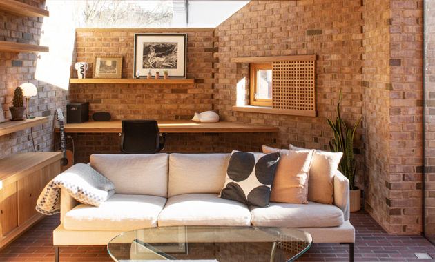 Materialbruken er tydelig og robust. Tilbygget er oppført med skallmurvegger i tegl, lagt med innsiden ut, og på østfasaden er det integrert en teglutsmykning som løfter frem murerhåndverket. Detaljeringen er gjennomgående nøye bearbeidet og lar materialenes struktur og håndverk tre tydelig frem, både visuelt og taktilt.