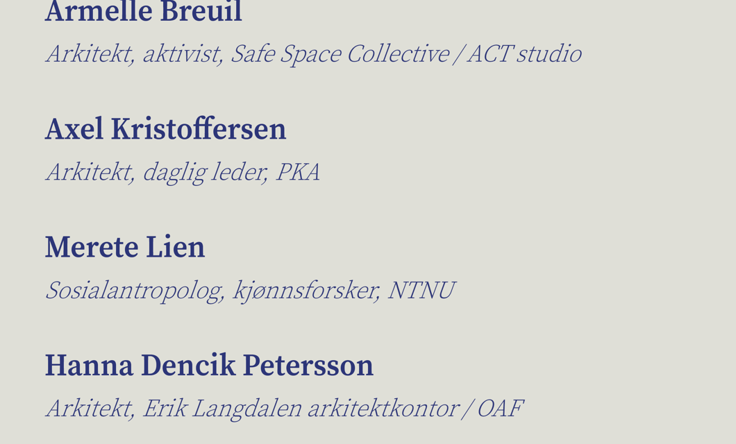 Som en introduksjon til samtale vil kvelden starte med et innlegg fra Armelle Breuil fra Safe Space. Videre vil Hanna Dencik Peterson fra Oslo Arkitektforening, presentere deler fra en fersk NAL undersøkelse om likestilling og mangfold.