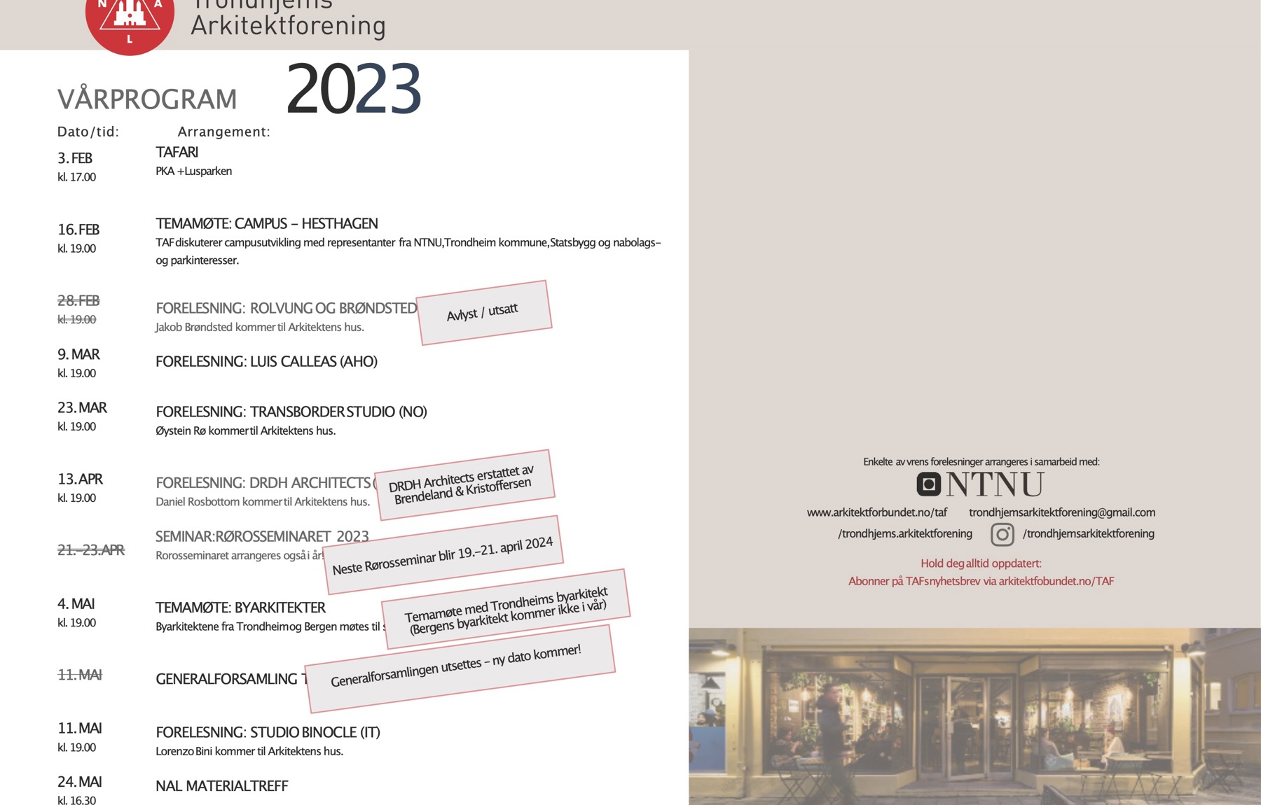 Programmet for våren med TAF – velkommen til forelesninger og temamøter på Arkitektenes hus! Senest revidert 05.05.2023.