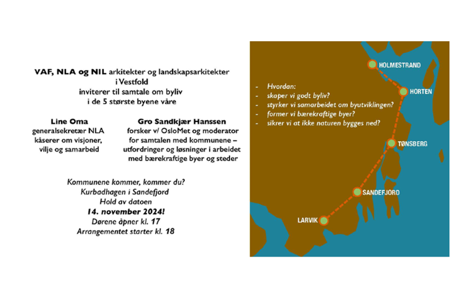 VAF, NLA og NIL, arkitekter og landskapsarkitekter i Vestfold inviterer til samtale om byliv i de 5 største byene våre.